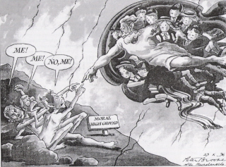 beeld. Links op de 'morele hoogvlakte': kardinaal Basil Hume,