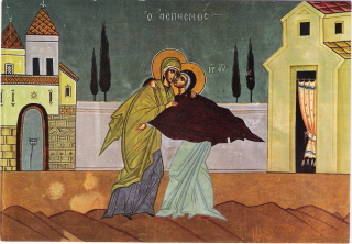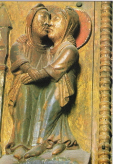 Ontmoeting tussen Maria en haar nicht (volgens het Lucas-evangelie de moeder van Johannes de Doper) Elisabeth, beiden